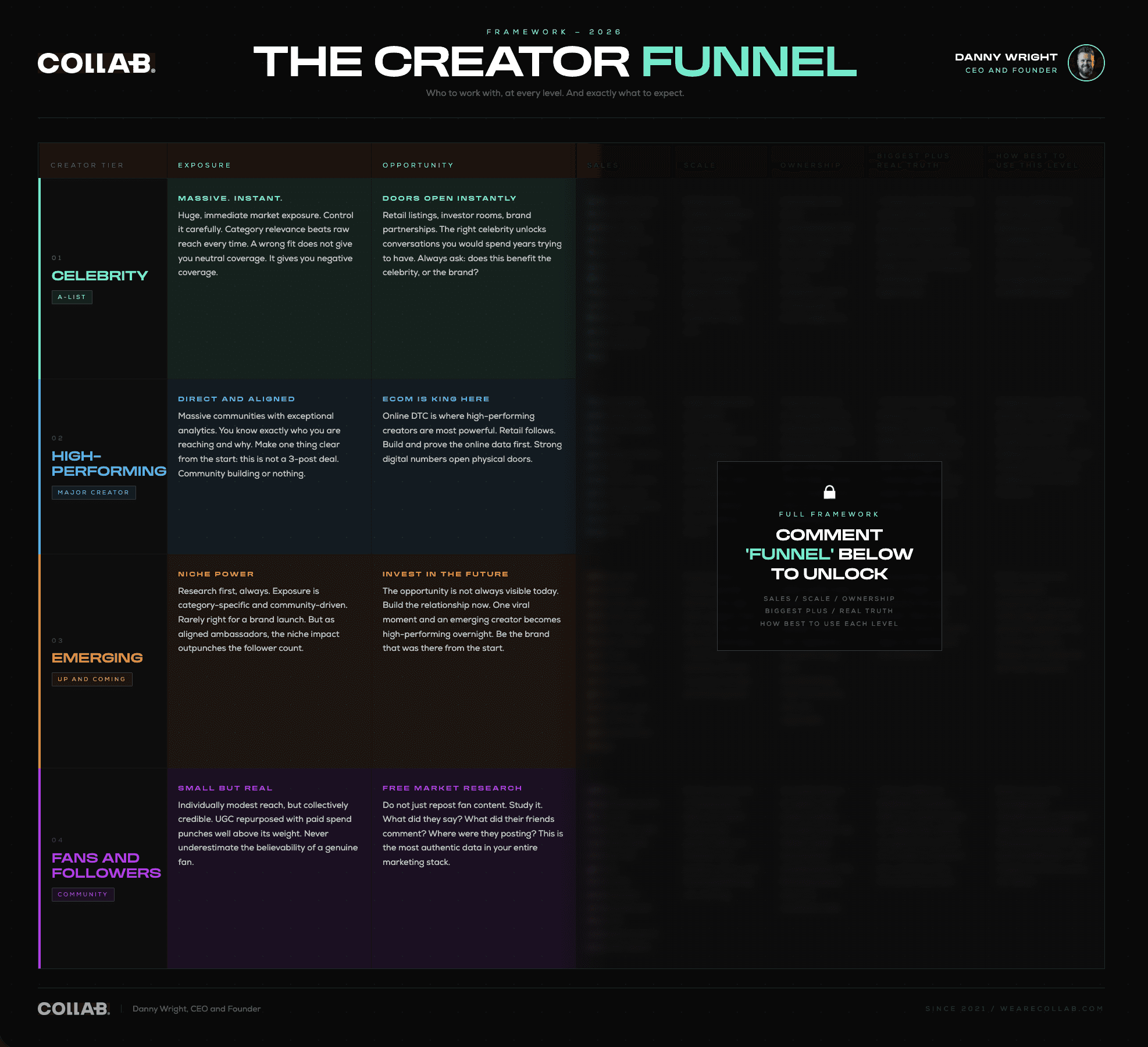 Followers Community | Small But Deeply RealIndividually modest reach, but collectively credible in a way nothing else is. UGC repurposed with paid spend punches significantly above its weight. Do not underestimate the believability of a genuine fan. It is the most trustworthy content you can have. | Your Best Market ResearchDo not just repost the content. Study it. What did they say about the product? What did their friends comment? Where are they posting from? This creator content, with no compensation involved, is the most authentic signal in your entire marketing stack. | Minority But MeaningfulSome affiliates at this level are highly effective, but it is a minority. Not a primary sales channel. But genuine community endorsement, unprompted and uncompensated, compounds over time and provides social proof at every tier above. | Scale Equals Data HereFor the Creator Funnel, scale at this level comes through data, not reach. Community growth tells you whether your product, story, and brand positioning are actually working. The most honest scorecard you have. | Tread CarefullyCrowdfunding is an option, but complex early cap tables create downstream complications. The Brewdog equity story is a cautionary tale worth studying before you go down that road. There is always a bigger fish. | +Real, unfiltered feedback and authentic UGC at a price point nobody can compete with. Your most honest brand signal. !Real truth: Barely recognised as part of the creator economy by most brands. In our world, we pay close attention to this tier at every stage. | Listen, Capture, AmplifyBuild community management infrastructure to capture UGC systematically. Repurpose the best content with paid amplification. Use the insight to inform product development, brand narrative, and creator selection across every tier above. |